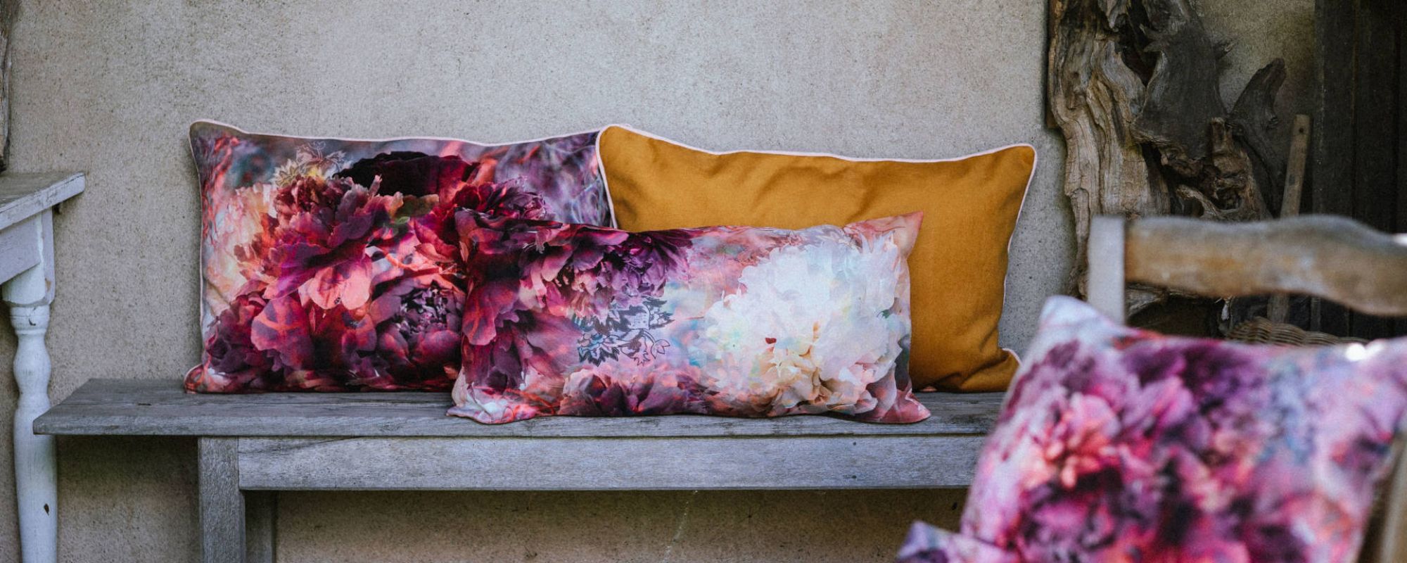 Les Pivoines Indiennes se déclinent dans toute la maison, de la table au salon jusqu’aux chambres à coucher, avec une large gamme de coussins & housses velours aux teintes dynamiques et délicates, et du linge de table en sergé de coton pour chaque occasion. De nombreux objets textiles (pochettes et trousses, sacs marins, eyes-pillow…) complètent cette collection, ainsi qu’un tissu d’ameublement vendu au mètre.
