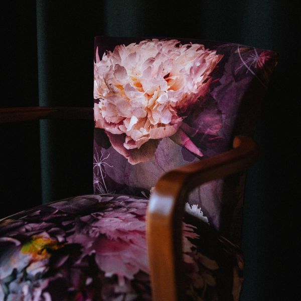 Courtepointe matelassée, velours qualité ameublement, 32 boutons recouverts, imprimé motif floral et baroque sur fond prune, tons de roses, blancs nacrés, ocres, mordorés – 60x160cm
