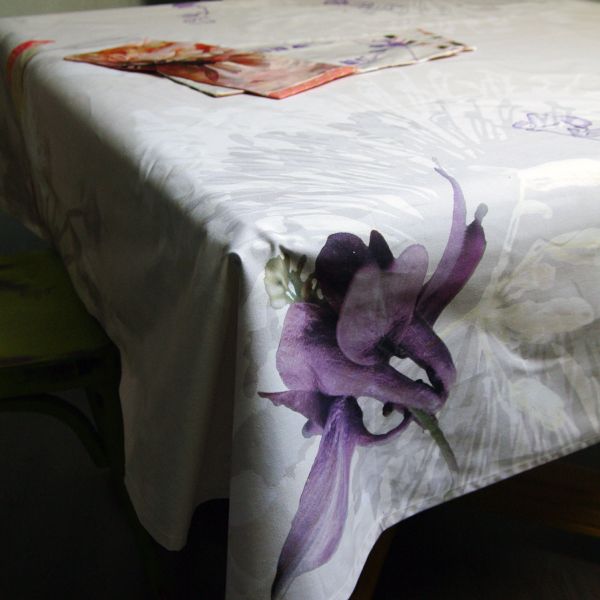 • Motif : fleur d’Ancolie et graphismes végétaux dans une déclinaison de gris, mauve et taupe.